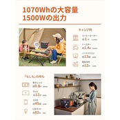 【定格出力1500W、容量1070Wh】60万人に選ばれたJackery大人気1000モデルの後機器、コーヒーメーカー(1120W)、ポータブルエアコン(1000W)、電子レンジ(960W)、ケトル(850W) などの家電製品にも対応できます。ドライブ、キャンプ、家族旅行、非常用、防災用に多用途。