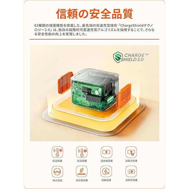 【進化したChargeShield2.0】62種類の保護機能を搭載した、先端の高速充電技術 「ChargeShieldテクノロジー2.0」 は、独自の段階的可変速充電アルゴリズムを採用することで、さらなる安 全性能の向上を実現しました。