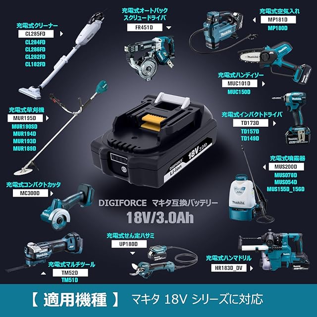 【対応機種】マキタ18Vスライド式バッテリー対応の各種電動工具・クリーナーにご使用いただけます。インパクトドライバ:TD172D、TD171D、TD161D、TD149DなどTDシリーズ/草刈機:MUR190U、MUR181DRFなどMURシリーズ/チェーンソー:MUC353D、MUC356DなどMUCシリーズ/空気入れ:MP180D、MP100DなどMPシリーズ/その他:TM51D、MC300D、FR451D、UP180D、HR183D_DVなど、様々な機種でご使用いただける、汎用性の高いバッテリーです。
