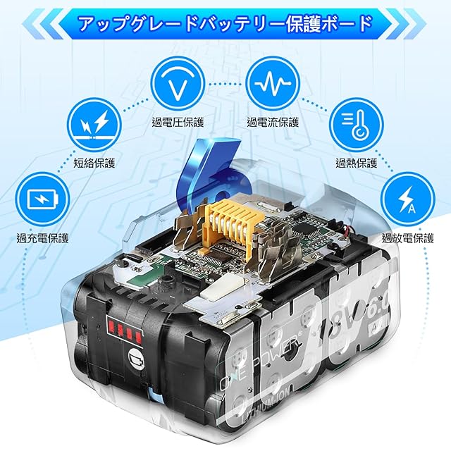 ★マキタ 18V バッテリーのアップグレードされたバッテリー保護ボードは、各セルをリアルタイムで監視するシステムを搭載しています。万が一、セルに異常が発生した場合には、迅速に電流を遮断し、バッテリーを保護します。さらに、短絡保護、過電流保護、過充電保護、過放電保護、過電圧保護、過熱保護など、複数の安全保護回路を搭載しており、充電や使用中のリスクを最小限に抑えます。この多重保護機能により、バッテリーの不良率が低減され、より安心してご利用いただけます。