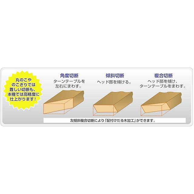 最大切断寸法(高さ×幅)(mm):[直角]60×115・[左右45°]60×80・[右52°]60×70・[左傾斜45°]45×110・[角度45°+左傾斜45°]45×75