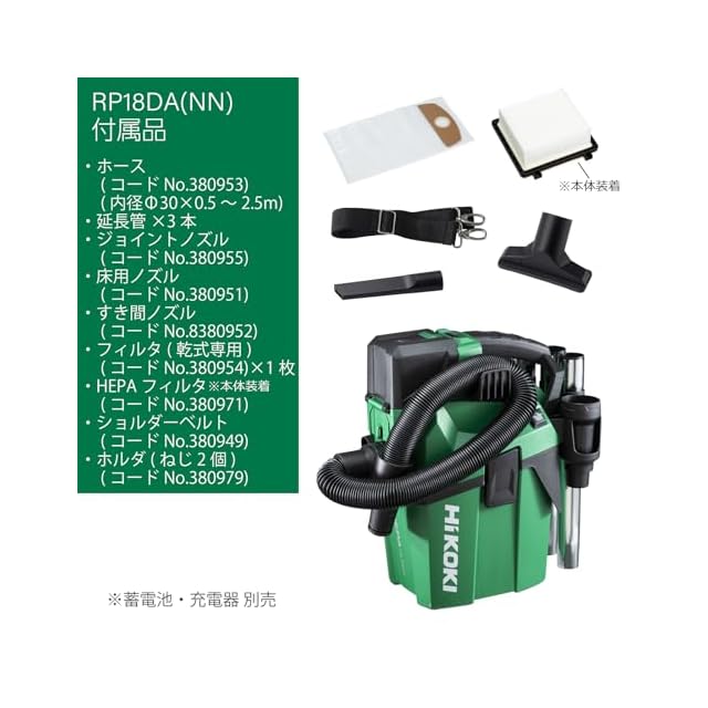 標準付属品:ホース(内径φ30×0.5~2.5m)、ジョイントノズル、延長管、床用ノズル、すき間ノズル、フィルタ(乾式専用)、HEPAフィルタ、ショルダーベルト、ホルダ(ねじ2個)