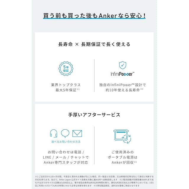 業界トップクラスの最大5年保証:Ankerならではの長寿命ポータブル電源だからこそ、業界トップクラスの最大5年保証付き。万が一、不具合が生じた場合もご心配ありません。