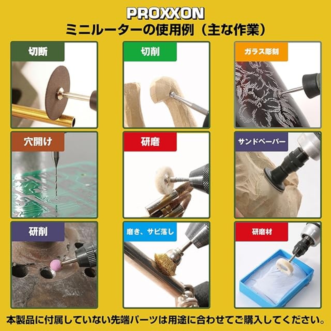 セット内容:コレットチャック2.35/3.0mm用(各1個)・ダイヤモンドビット2種(各1本)・ハイスビット2種(各1本)・純毛バフ(軸付き)2種(各1本)・純毛バフ(ディスク)2枚・軸付き砥石(WA)4種(各1本)・シリコンバフ1本・切断砥石5枚・ワイヤーブラシ(鉄)1枚・専用シャフト2本・専用ビットケース1個・ツールスタンド 1個・スパナ 1本