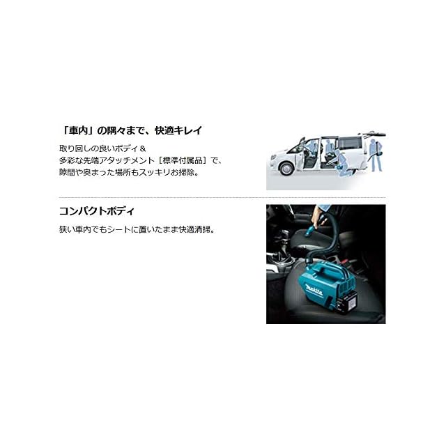 標準付属品の先端アタッチメントで車内まるごと清掃。シート、フロアマット、ダッシュボード周辺、ドアポケット等の清掃に。石や砂の吹飛ばしにも。車内の隅々まで、快適キレイ!狭い場所でも取り回しの良いコンパクトボディ。