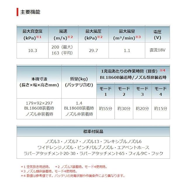 直流18V、スライド式Li-ionバッテリ仕様。バッテリ・充電器別売。1充電あたりの連続使用時間(BL1860B使用、ノズル非装着時目安):モード1 約55分/モード2 約30分/モード3 約20分/モード4 約15分