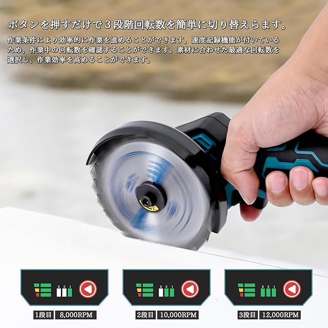 【3段階スピード調整】ボタンを押すだけで3段階回転数を簡単に切り替えらのは大変便利です。作業条件により効率的に作業を進めることができます。1段目は8000RPM、2段目は10000RPM、3段目は12000RPMの回転数を調整することができます。また、速度記録機能が付いているため、作業中の回転数を確認することができます。素材に合わせた最適な回転数を選択し、作業効率を高めることができます。さらに、回転数を調整することで、刃の寿命を延ばすこともできます。