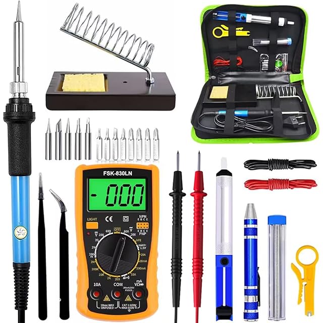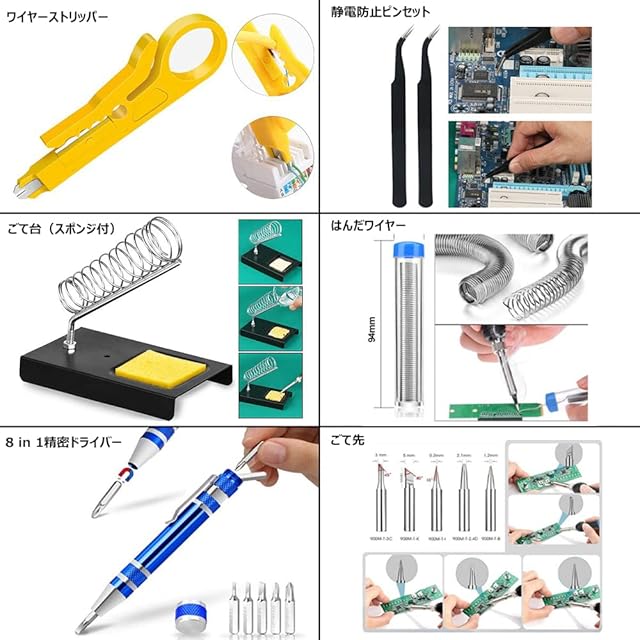セット内容:はんだごて*1、こて先*5、マルチメータ*1、ごて台(スポンジ付)、はんだワイヤー*1、はんだすいとり器*1、静電防止ピンセット*2、8 in 1精密ドライバー*1、ワイヤーストリッパー*1、電子ワイヤー*2、英語マニュアル*1、商品概要(日本語)*1、PC収納バッグ*1