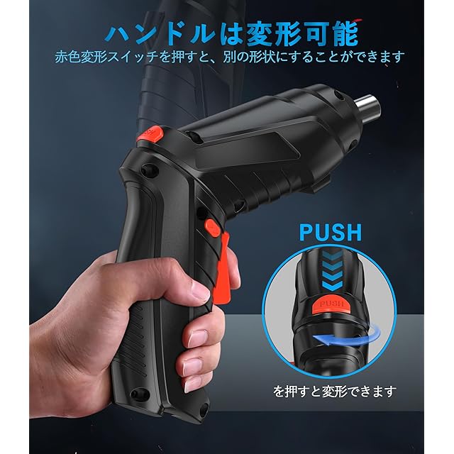 [正逆転切り替え可能】正逆転レバーの位置を調整することで、ドリルの回転方向を切り替え、ネジを緩めたり締めたりすることができます。 正逆レバーを切り替えるだけの簡単操作で、家具などにも幅広く使えます。PUSH」ボタンを押しながらハンドルを回すとドライバーハンドルの形状が変わり、ハンドルを90°回転させるとガン型からストレート型になります。 付属のエクステンションバーを使えば、死角や狭い場所での作業にも柔軟に対応できます。 (*注:使用しないときは、突然の作動による怪我を防ぐため、回転スイッチレバーを中央に置いてください)