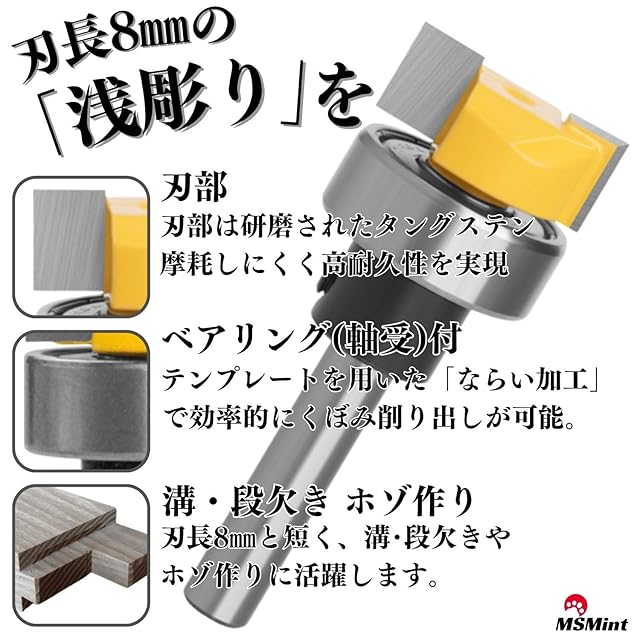 コロ付 : 4本ともベアリング(コロ付)付きですので、テンプレートを使用した「ならい加工」で効率的に 浅彫り 浅堀り 溝欠き 段欠き ほぞ加工 などが可能