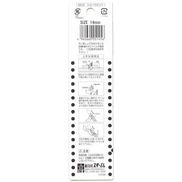 メーカー名:(株)スターエム/【 特長 】/・先ネジの回転力を利用してスムーズに穴あけが行えます。/・滑らかな溝面で、切りくずの排出が抜群です。/【 用途 】/・被削材:木材。/・浅い貫通穴に。/【 仕様 】/品名:スターエム ショートビット 14.0/品番:5-140/刃径(mm):14/溝長(mm):70/全長(mm):120/シャンク形状:六角軸/シャンク径(mm):6.35/【 材質/仕上 】/普通鋼/質量:47g/JANコード:4962660051456/【 注意 】/●作業中は必ず保護具を着用してください。/