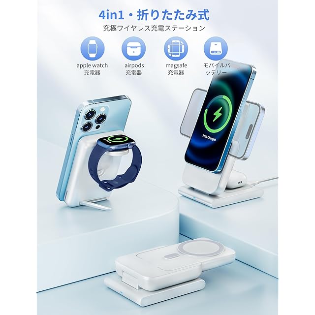 【使用便利・製品仕様】マグネット式ワイヤレス充電器では、好みの角度でiPhoneを充電することができるように、背面に内蔵式スタンドが付きます。iphoneを縦置きや横置きでも、日常のあらゆる使用シーンに応じて調整できます。自宅では省スペースで複数のデバイスの充電を担うマルチデバイス充電器として、外出時や緊急時には安心のコンパクトなモバイルバッテリーとしても便利です。パッケージ内容:4in1ワイヤレス充電器、USB-C & USB-C ケーブル、メダルリング、取扱説明書。※安心保証:ご購入日より一年間。何がご質問やご要望がございましたら、お気軽に弊社のメールアドレスまでご連絡お願い致します。