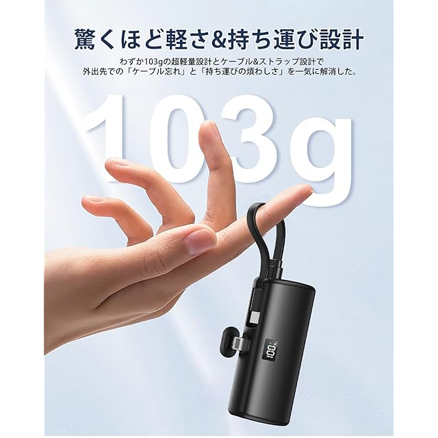 【驚きの小ささで5000mAhの大容量】このモバイルバッテリーは、小さなボディの中に驚きの5000mAh大容量を搭載。これだけの容量があれば、スマホやタブレット、その他のデバイスがバッテリー切れを起こしても心配無用!まるで小さな発電所のように、あなたのデバイスに安定した電力を供給します。旅行や外出先でも長時間安心して使用でき、超コンパクトながら驚くべきパワーを持つこのモバイルバッテリーを、ぜひ実感してみてください!【わずか96グラムの超軽量設計】超軽量で、まるでポケットサイズの小さな宝石!たった96グラムで、まるで口紅や3個の卵のような軽さ。ポケットやハンドバッグにすっぽり収まり、重さを感じることなく持ち運びが簡単。軽量でコンパクトなデザインにより、外出先でも便利に使用でき、ストレスフリーなモバイルライフを楽しめます。どこへでも持ち運べて、いつでもどこでも充電可能です。