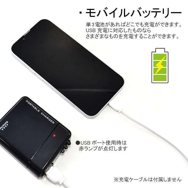 単三電池が2本あればいつでもどこでも充電が可能です。
