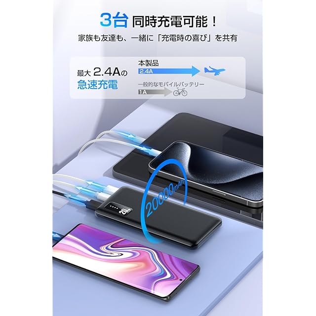 【最大2.4A急速充電・3台同時充電】この モバイルバッテリー は、最大2.4Aの出力を提供する急速充電機能を搭載し、短時間でデバイスを満充電にします。一度に最大3台のデバイスを充電可能で、複数のUSBポートを通じてスマートフォン、タブレット、その他のUSB充電式デバイスを同時に効率的に充電できます。友人や家族とのシェアも簡単で、みんなのデバイスをサポートできます。