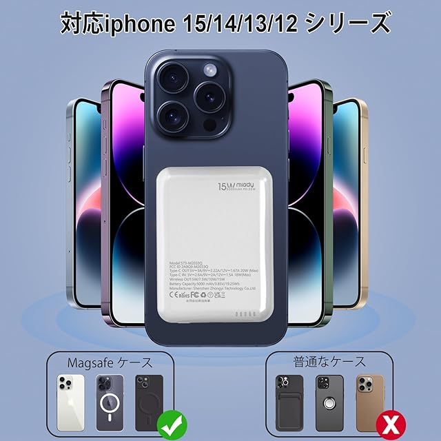 Miady magsafe モバイルバッテリー5000mAh マグセーフ ワイヤレス出力(15W) Type-C出力(20W)/入力 PD&QC対応 軽量 小型 薄型 急速充電 2台同時充電可能 LED残量表示 旅行/出張/持ち運び便利 iPhone/Android各種対応