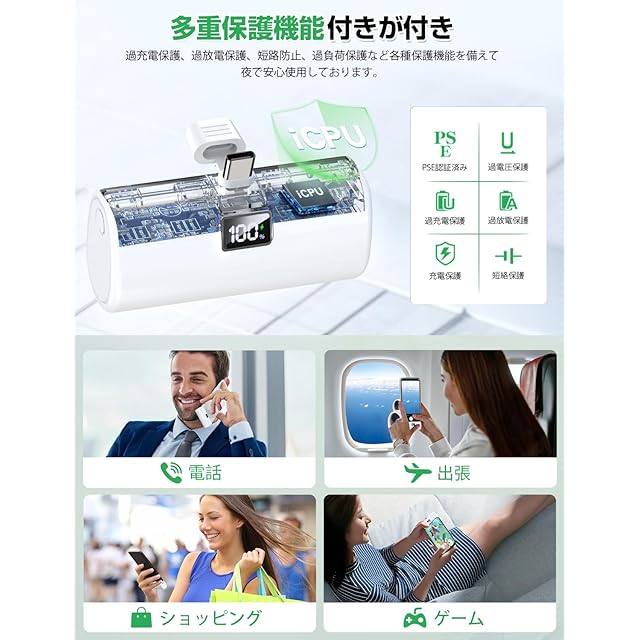 「最適化された充電プロセス」充電中は、内蔵されたインテリジェントチップがデバイスの充電要求を自動的に認識し、最適な電力を供給します。これにより、過充電や電力不足の心配がなく、効率的かつ安全に充電が行われます。さらに、充電中も過熱を防ぐ設計となっており、デバイスやモバイルバッテリー本体の安全性を確保しています。「多重保護機能搭載」複数の保護機能が搭載されており、過充電、過放電、短絡、過熱など、さまざまな危険からデバイスとバッテリー本体を守ります。これにより、安心して長期間使用することができます。「スマートな互換性を持つモバイルバッテリー」スマホ、タブレット、Bluetoothイヤホン、スマートウォッチなど、ライトニングやUSB-C端子を搭載した電子機器に簡単に接続可能です。※スマホ:iPhone16/iPhone15/iPhone14/iPhone13/SamsungGalaxy S25/Galaxy S24/Galaxy S23/Galaxy Z Flip6/Galaxy Z Fold6/Galaxy A25など各種機種に対応します。
