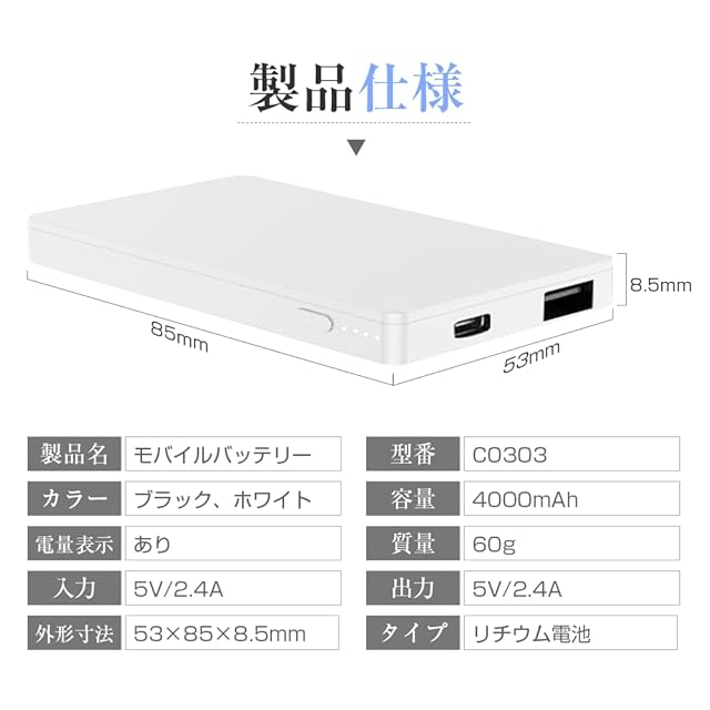 【世界一軽薄型】リチウムバッテリー圧縮技術を採用して本来の厚度35%カットして、重さは僅か60g、僅か8.5MMの厚みの超薄型で超ミニサイズになります!邪魔にならず財布で簡単収納出来ます。旅行、出張中に大活躍してくれます!