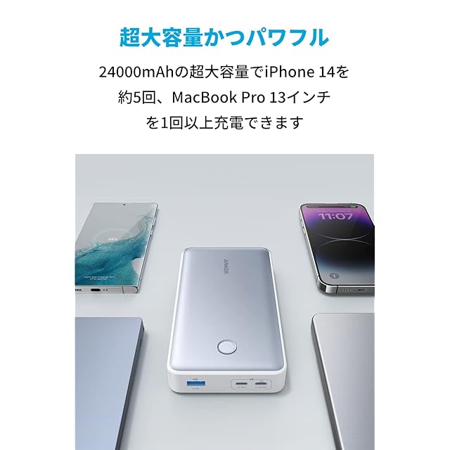 超大容量かつパワフル:24000mAhの超大容量でiPhone 14を約5回、 MacBook Pro 13インチを1回以上充電できます。