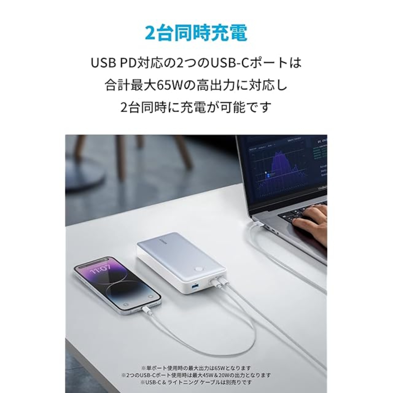 2台同時に充電:USB PD対応の2つのUSB-Cポートは最大65Wの高出力に対応し、お使いのUSB-C対応機器を2台同時に充電が可能です。また、USB-Aポートを使用することで3つの機器を同時に充電できます。※2ポート使用時はUSB-C1で45W、USB-C2で20Wでの充電が可能です。