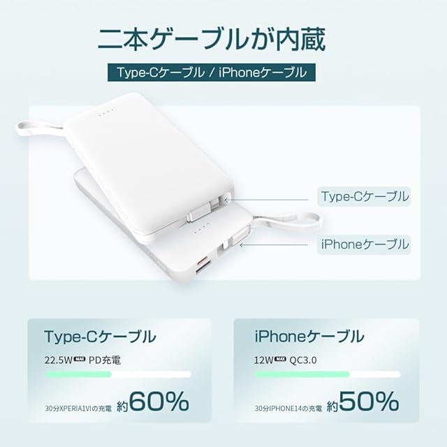 【2本ケーブル内蔵 】:iPhoneとAndroid機種へ充電できるケーブルが2本内蔵され、それぞれのケーブルを用意しなくても、iPhone用/Type-Cなどデバイスを充電でき、ケーブルを持ち歩くという手間から解放されます!