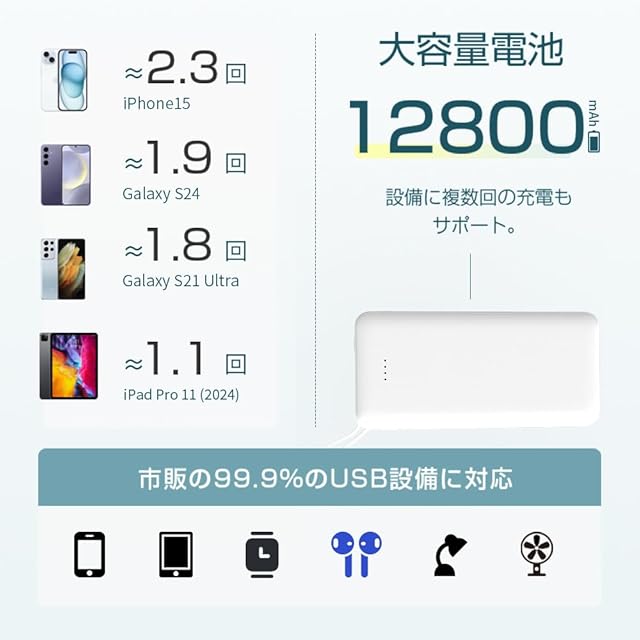 【12800mAh大容量バッテリー】この充電宝は12800mAhの大容量バッテリーを搭載しており、一度の充電でスマートフォンを複数回充電することが可能です。旅行やアウトドア活動でも安心して使用できます。