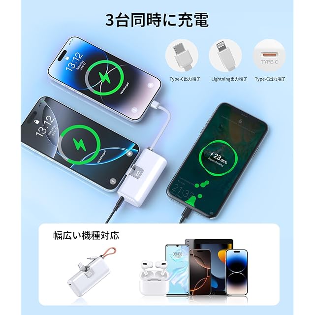 【3台同時に充電・幅広い機器対応】USB-C端子一体型によりケーブルいらずで充電可能。充電しながら快適なスマホ操作を実現。Lightningケーブルも内蔵し、あらゆるのアップル製品(iPhone/iPad/AirPodsなど)と互換性があります。Type-Cポートは入出力兼用で、3台の機器を同時に充電可能です。お使いのiPhoneケースを外すことなく、そのままご利用いただけます。