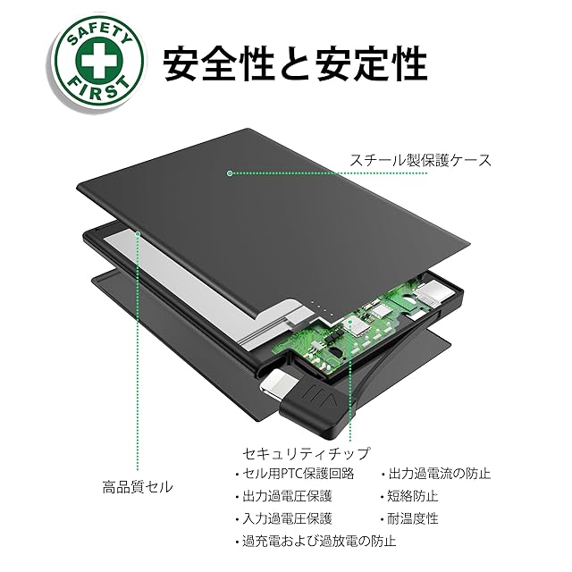 【ケーブル内蔵】内蔵のケーブルは出力用ですので、ケーブルを別途用意しなくても充電できます。通勤や出張、旅行、救急モバイルバッテリー、とても便利です。