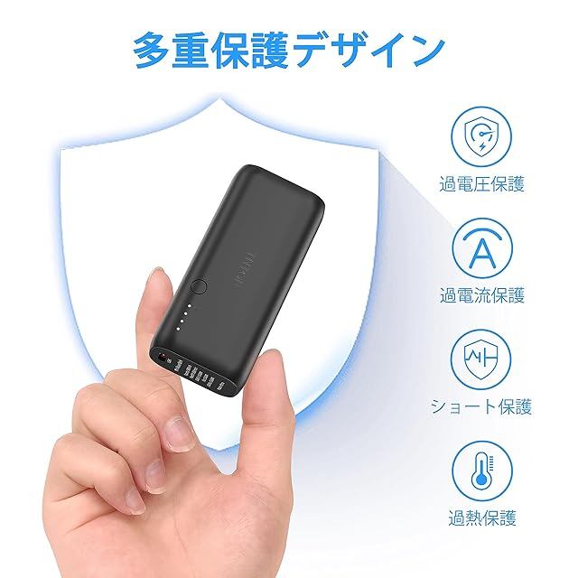 驚きのコンパクトサイズ:75*25.5*35.5mmのサイズと98gの重さ、5000mAhの中で最小・最軽量のモバイルバッテリーであり、一日外出の時こちら一個さえ持っていれば、スマートフォン電源切れのことご心配必要ありません。ご注意:本製品はインバーター作業ファンと空調服に適用されません。