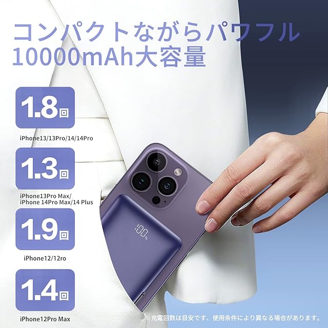 【急速充電】磁気吸着式ワイヤレスモバイル電源は10000 mAhの大容量で、無線充電の際、MagSafe対応iPhoneの場合は7.5W出力、Androidスマートフォンの場合は最大15W出力という急速スピードで充電可能です。有線充電の際、USB-Cポートは最大18W PD入力、20W PD出力の仕様で急速充電を実現でき、わずか30分でiPhone14/13を50%まで充電できます(Euker調べ)。