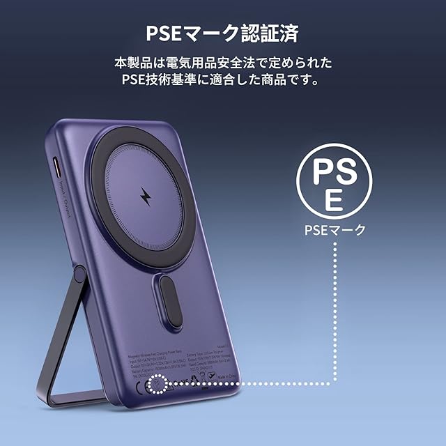 【折りたたみ式スタンド付き】ワイヤレスモバイルバッテリー多機能の折りたたみ式スタンドが内蔵されているため、動画の視聴時や会議などでも安心して見やすい角度に保ちながらマグネット式ワイヤレス充電できます。使用しない時にもスッキリ収納できます。また充電ポートが側面に配置されているため、本体を充電ケーブルに接続しながらご使用の機器を充電することができます。