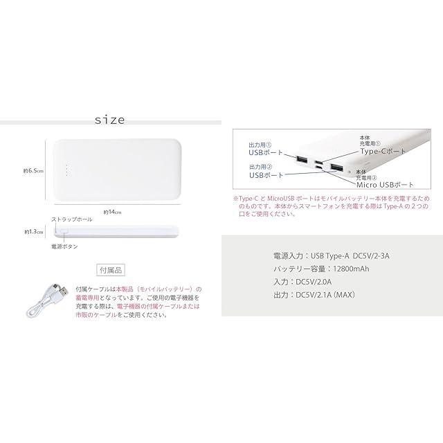 【商品詳細】カラー:ホワイト / バッテリー容量:12800mAh / 入力:DC5V/2.0A / 出力:DC5V/2.1A(MAX) / サイズ:(約)140×65×13mm / 重量:(約)240g