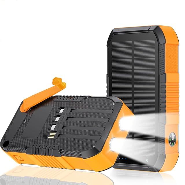 【3WAY蓄電&IPX7防水&耐衝撃】本製品はIPX7防水・防塵等級があり、USBポート部分には厚いカバーがあり、強風、埃、突然の雨などどんな天候にも耐えられます。製品の外部材質はABS+PCで、落下の衝撃に耐えることができます。入力用のmicroUSBポートと入出力用のType-Cポートを備えており、USB電源からの電力を本体に蓄電することができる。また、ケーブルを忘れても本体に蓄電できる手回しクランクに加え、内蔵USBケーブルを追加することもできる。(注:ソーラー充電は満充電まで時間がかかるため、通常はUSBケーブルでの充電を推奨)。