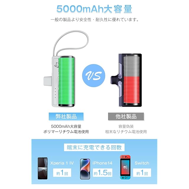 【超小型・5000mAh大容量】コンパクトながら、搭載してるバッテリー容量は3.7V/5000mAhなので、スマホを約1〜1.5回前後充電できるスペックがあります。通勤通学の際にカバンに入れておけば、スマホ・タブレットの充電切れ対策になります。ちょっとした外出ならこれで十分!