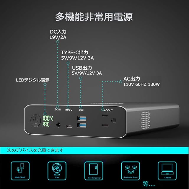 【AC出力対応】コンセントを差し込むだけで、ノートパソコンや幅広い電気機器 ( 最大130W )へ給電できます。旅行時、停電時や緊急時のバックアップ電源としてご利用いただけます。