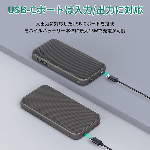※本製品にはUSB充電器は付属しておりません。モバイルバッテリー本体の充電を行う際はUSB-A to Cケーブルでの充電に対応したUSB充電器を別途ご用意ください。