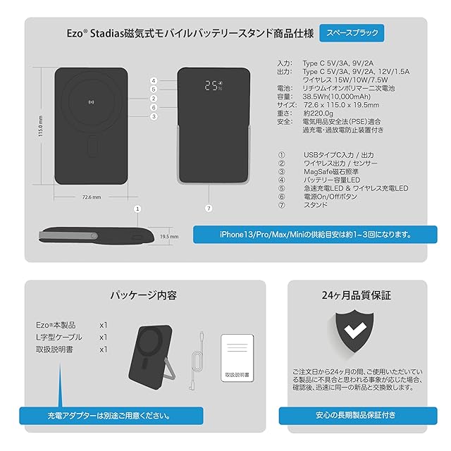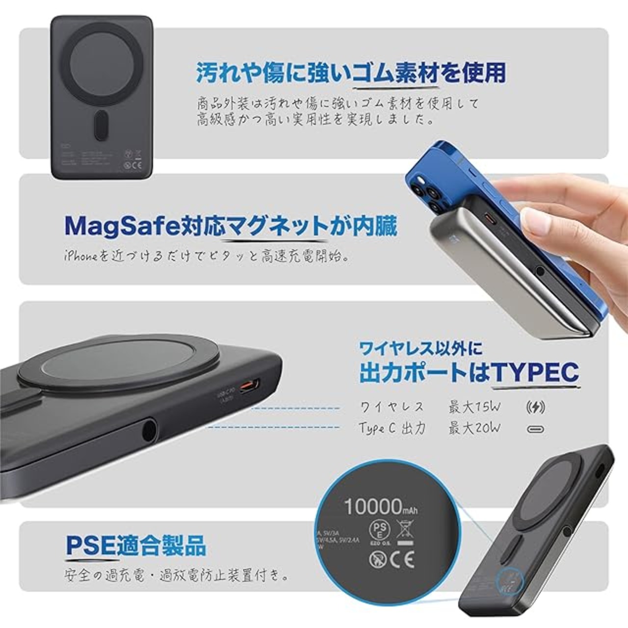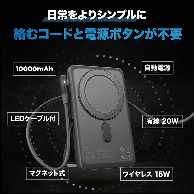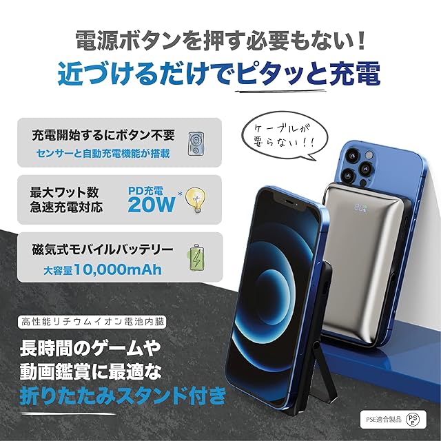 ❺【スタイリッシュかつ高性能】155*75*15.4mmのサイズと235gの重さ。ワンタッチで充電、コンパクト、人間工学に基づいた手に馴染むようなデザイン。磁気吸引後、キーを1回押すと、ワイヤレス充電が開始されます。MagSafe受電技術を採用し、モバイルバッテリーの上に置くだけで充電できます。移動が多い方や通話の頻度が高い方は気楽にポケットやブリーフケースに入れることができます。