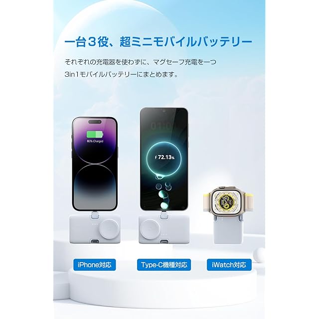 【3in1ポータブルモバイルバッテリー】iWatch用ワイヤレス充電、iphone用コネクター、Type-Cコネクターが搭載された3in1ポータブルモバイルバッテリーです。一台三役でiWatch ultra/8/7/6/SE/5/4/3、i-Phone15、14全シリーズ、Airpods、Androidスマホなどの幅広い機器にフルスピード充電が可能です。
