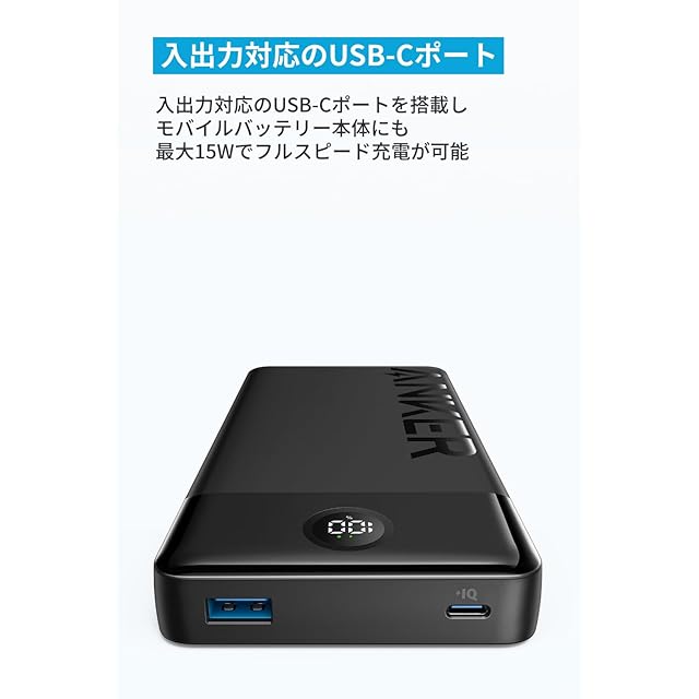 パッケージ内容:Anker Power Bank (20000mAh, 15W, 2 Port) 、USB-C & USB-A ケーブル、取扱説明書、カスタマーサポート