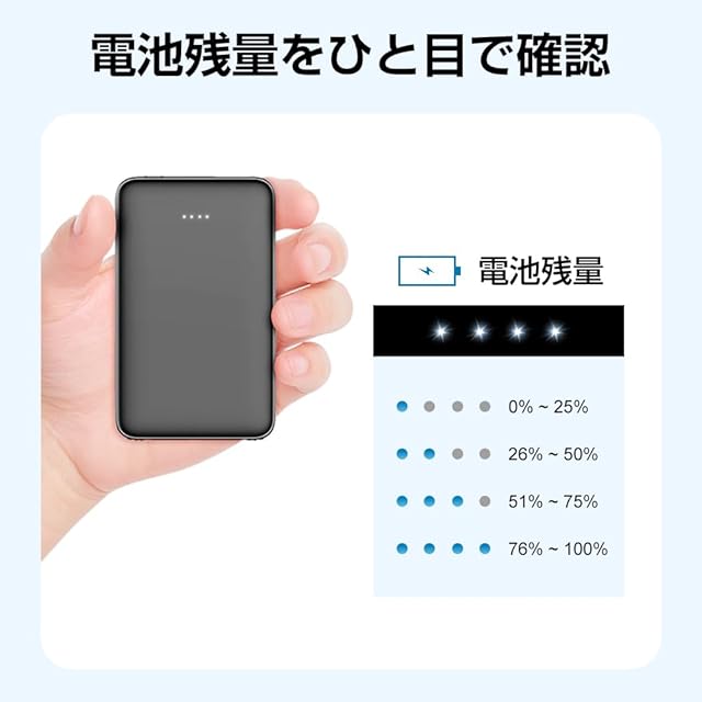 【PSE認証済・安全】pse認証済み、デバイスを安全に保ち、充電をより安全かつ効率的にします。内部は過充電、過電圧保護、温度保護など優れた機能を搭載し、充電によって生じる恐れのある放熱や発熱といった症状からお客様とお使いの機器を保護します。セキュリティとパフォーマンスの両面において完璧に検証されています。コンパクトなサイズと適切な容量であり、機内に持ち込んでも問題ありません。