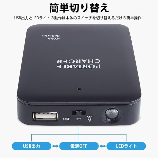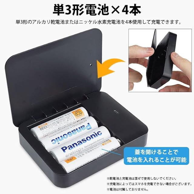 単三電池×4本でスマートフォン等を充電することができる電池式モバイルバッテリー