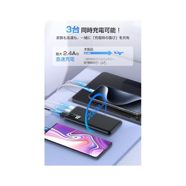 【20000mAh大容量 |長時間の安心を提供】この モバイルバッテリー は、20000mAhという 超 大容量 を誇り、iPhoneやAndroidスマートフォンを最大5〜6回以上フル充電可能です。タブレット、スマートウォッチ、ワイヤレスイヤホンなど、複数の デバイス にも十分な電力を供給できる モバイルバッテリー です。キャンプ、旅行、通勤、ビジネス、災害時の非常用電源など、あらゆるシーンで頼れる大容量 モバイルバッテリー です。飛行機持ち込み可能な容量で、国内外の旅行にも安心して使える モバイルバッテリー です。