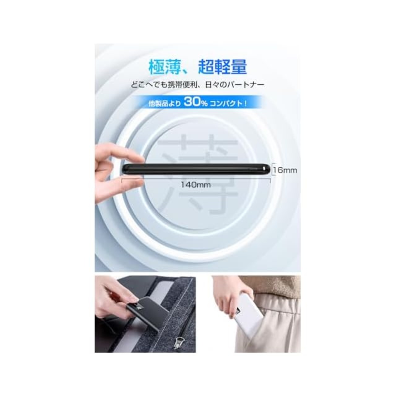 【超軽量・小型設計|持ち運びやすい】コンパクトながらパワフルなこの 軽量 小型 モバイルバッテリー は、厚さ約18mm、重さ約230gの軽さで、バッグやリュックはもちろん、コートのポケットにもすっぽり収まります。女性でも片手で簡単に持てるサイズ感で、カフェや出張、フェス、登山、災害避難など様々なシーンに最適。色は ブラック 、ホワイトがあり、小さいのに高性能、見た目もスタイリッシュな 携帯型 モバイルバッテリー です。外出時の携帯にぴったりな軽量 携帯充電器 です。