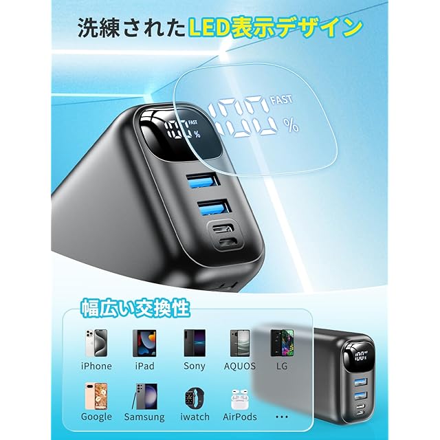 【50000mAh大容量・22.5W超急速充電】現在世の中で、スマートフォンの使用ニーズは最も重要になり、出張中や旅行中に、急にデバイスのバッテリーが不足と焦る方もいると思います。弊社の「P5」はモバイルバッテリー業界で稀少の50000mAh大容量であり、一度満充電にすると、数日充電しなくても使用可能です。また、アメリカのQualcomn社が開発した、スマートフォンやタブレットを急速で充電できる仕組みを採用、Quick Charge3.0に対応したスマートフォンであれば、通常の急速充電と比較しても遥かに早い速度3.0Aで充電が可能です。さらに、⚡急速充電技術PD (Power Delivry)かつAFC/FCP/SCPに対応により、最大20W出力のUSB Type-Cポートと、最大22.5W出力のUSB Type-Aポートを備え、全てのアップル製スマートフォンやタブレット、ほとんどのアンドロイド機器に対して急速充電することができます。このバッテリーは手に入れたら、外出にしてもスマートフォンやタブレットに思い切って使用できます。