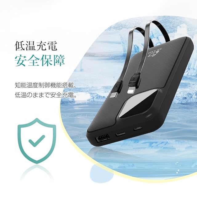 【3台同時充電】本製品は2本のケーブルが一体型になっているのですぐに充電ができる便利なアイテムです。ケーブルをバッテリーの背面に収納できるため、ケーブルが絡まらずスッキリと持ち歩くことができます。Type-C/iPhone出力ケーブル+1つのUSB-A出力ポートで3台の設備を同時に充電できます。
