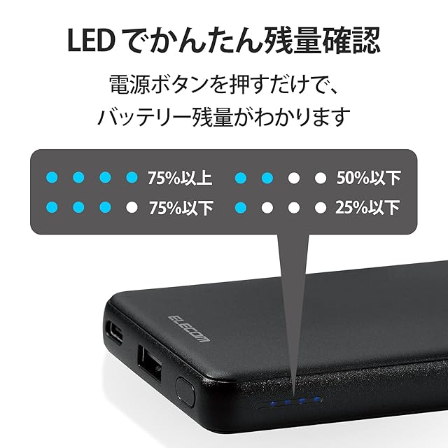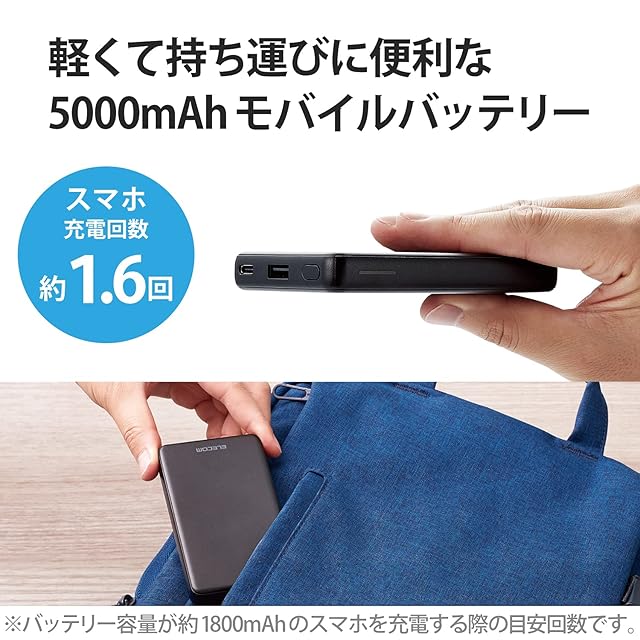 本製品(バッテリー容量5000mAh)でスマートフォンを約1.6回充電可能です。※満充電をした本製品を用い、バッテリー容量が約1800mAhのスマートフォンを充電する際の目安回数です。充電中に電源が入ったり、機器を使用している場合は記載の数値まで充電できない場合があります。