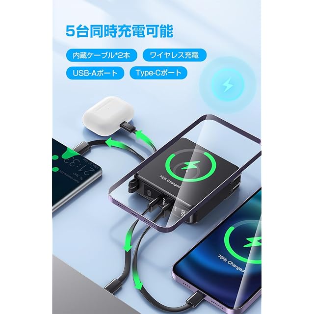 【5台同時充電可能】普通の有線充電は最高15Wの急速充電が可能です。5台の端末に電力を供給可能で、家族と友達と一緒に充電の楽しみをシェアします。