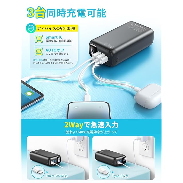 【50000mAh大容量&2024年業界初登場】 モバイルバッテリー 22.5W急速充電 三台同時充電可能 2WAY入力(Type-C+Micro) LED残量表示 スマホ充電器 携帯充電器 iPad/iPhone/Android各種スマホ対応 PSE認証済み&安全回路保護 旅行/出張/アウトドア/キャンプ/停電対策/防災 日本語取扱説明書
