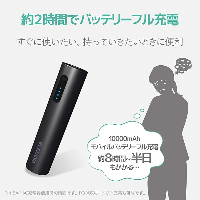 モバイルバッテリー本体を約2時間で充電でき、チャージ時間を大幅に短縮することができます。※出力1.8A以上のACアダプタ使用時。