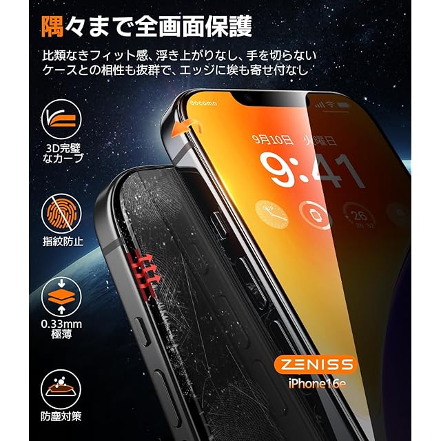 【業界最強硬度レベル!10H 強化ガラス フィルムで究極の保護を】弊社のiphone 16e フィルムは、米軍規格の航空宇宙グレードの高アルミシリコンガラス素材を使用し、最新のNa+/K+イオン交換技術により、ガラス内部に圧縮緩衝層を形成しています。1200℃で10時間の高温硬化を繰り返し強化、業界最強の10H硬度レベルを実現。硬度と耐衝撃性が市販の普通製品より20倍も高いです。200%の保護力で衝撃や傷からiPhoneを最大限に守ります。鍵やコインなどの鋭利な物と一緒にバッグに入れても傷がつきません。さらに、ガラスは破片飛散防止加工が施されており、使用者の安全を確保する。 安心してお使いいただけます。絶対的な安心感を与えます!
